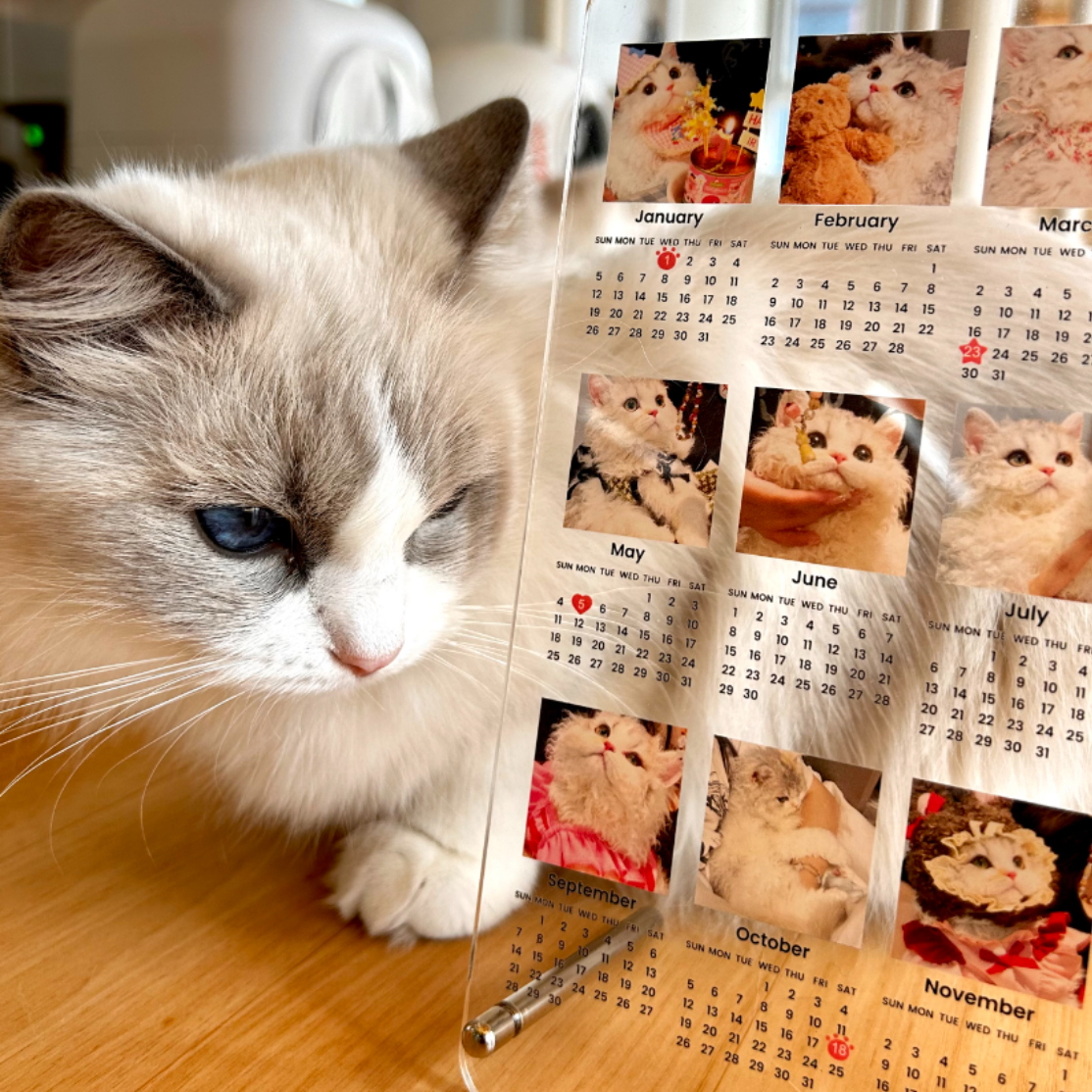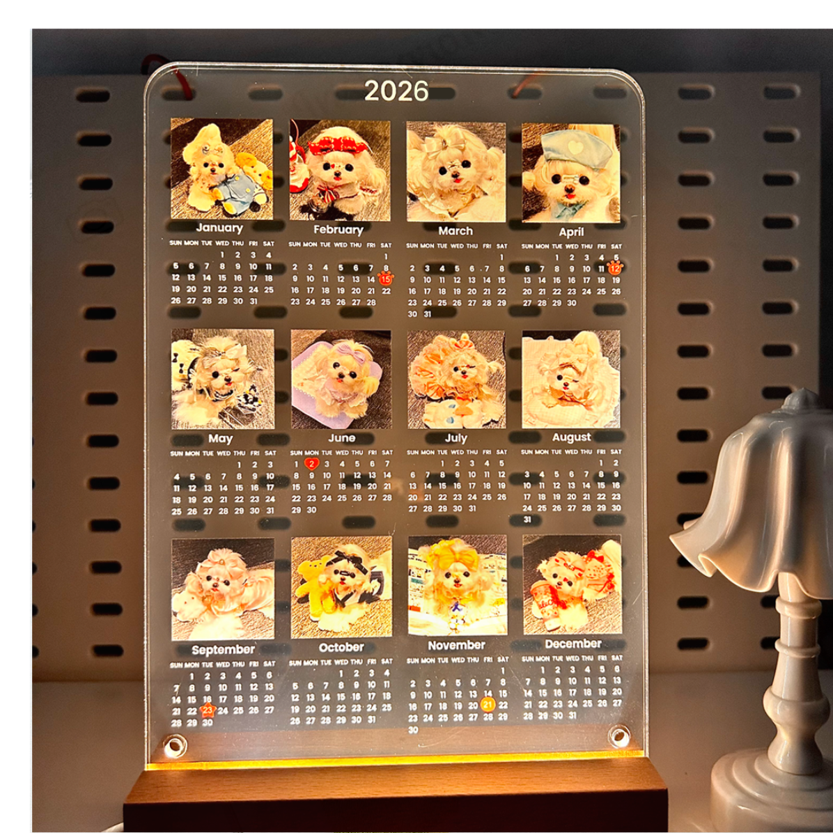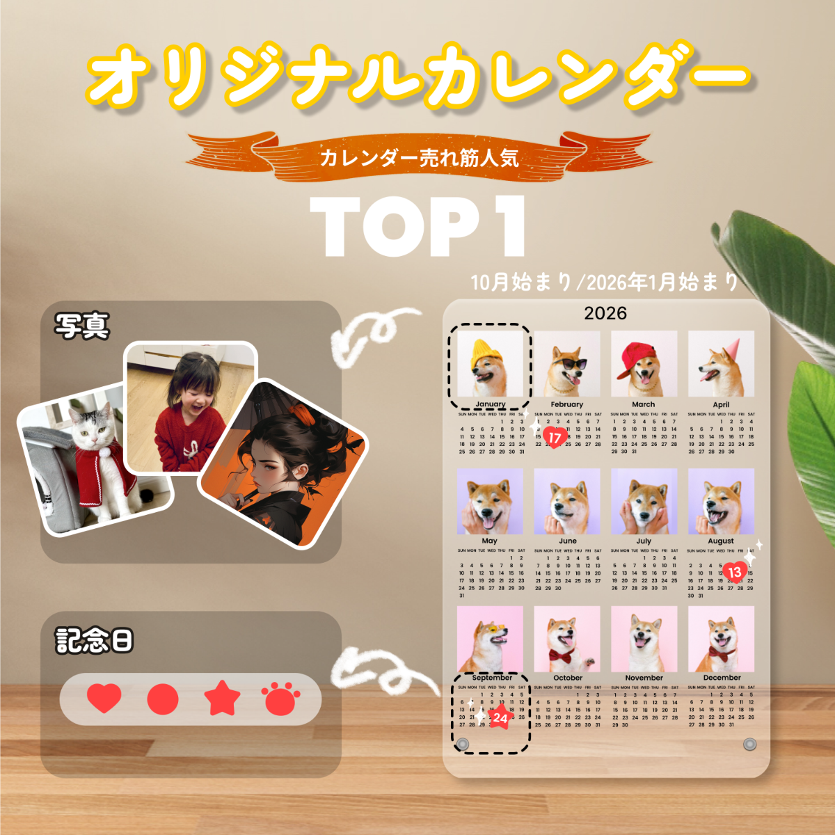 WOWオリジナル 12枚写真カレンダー2025年10月始まり/2026年1月始まり・記念日や誕生日にマークをつける・アクリル・縦型・12枚写真・ライト